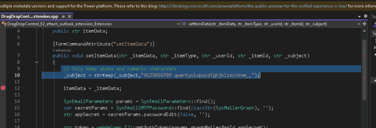 To work around this limitation - add this code to the top of the setItemDate method in the DragDropControl_E2_ettach_outlook_extension_Extension class: